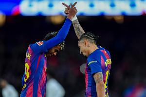 本赛季4位上演帽子戏法的巴萨球员是莱万多夫斯基、费兰·托雷斯、亚马尔和拉菲尼亚。